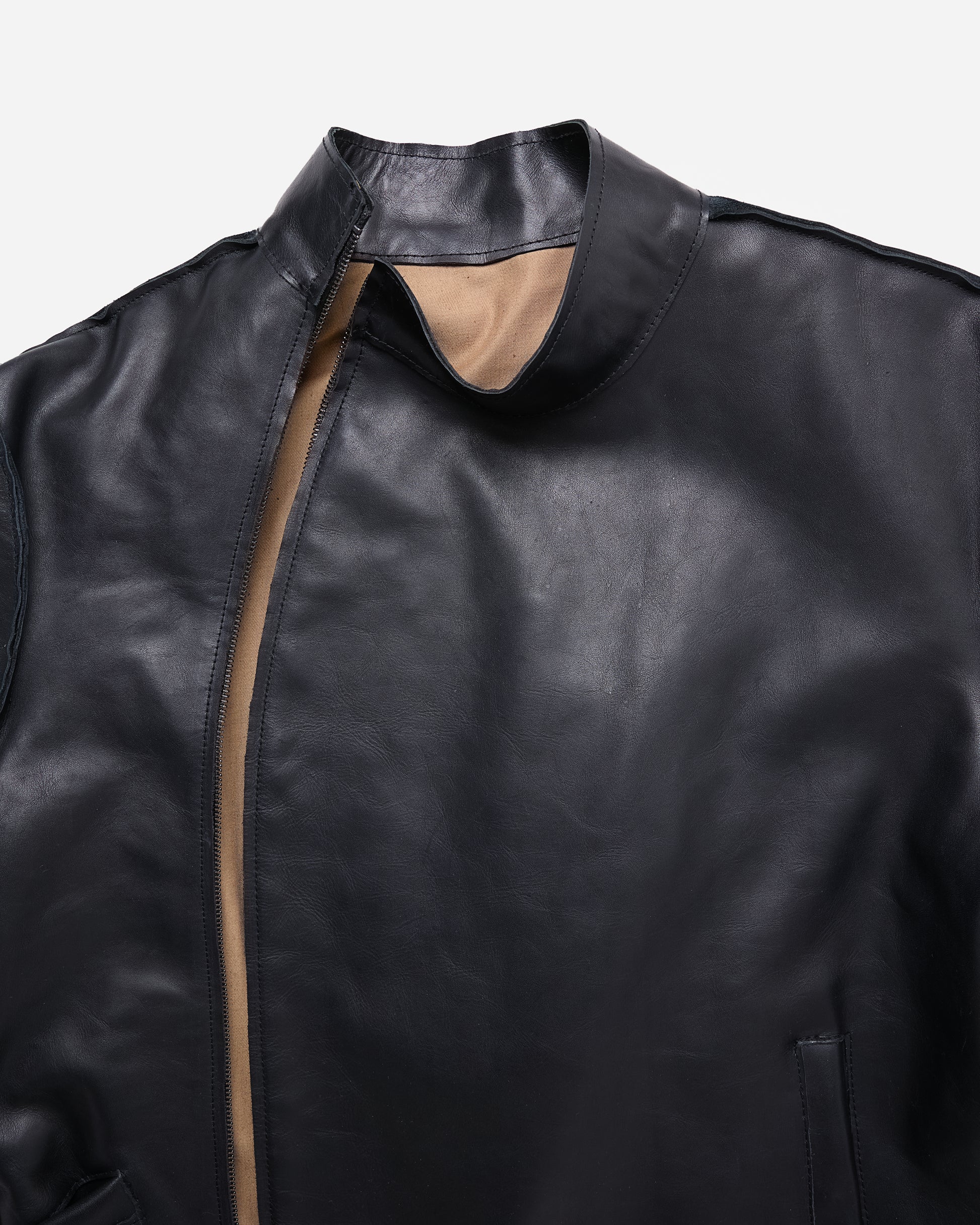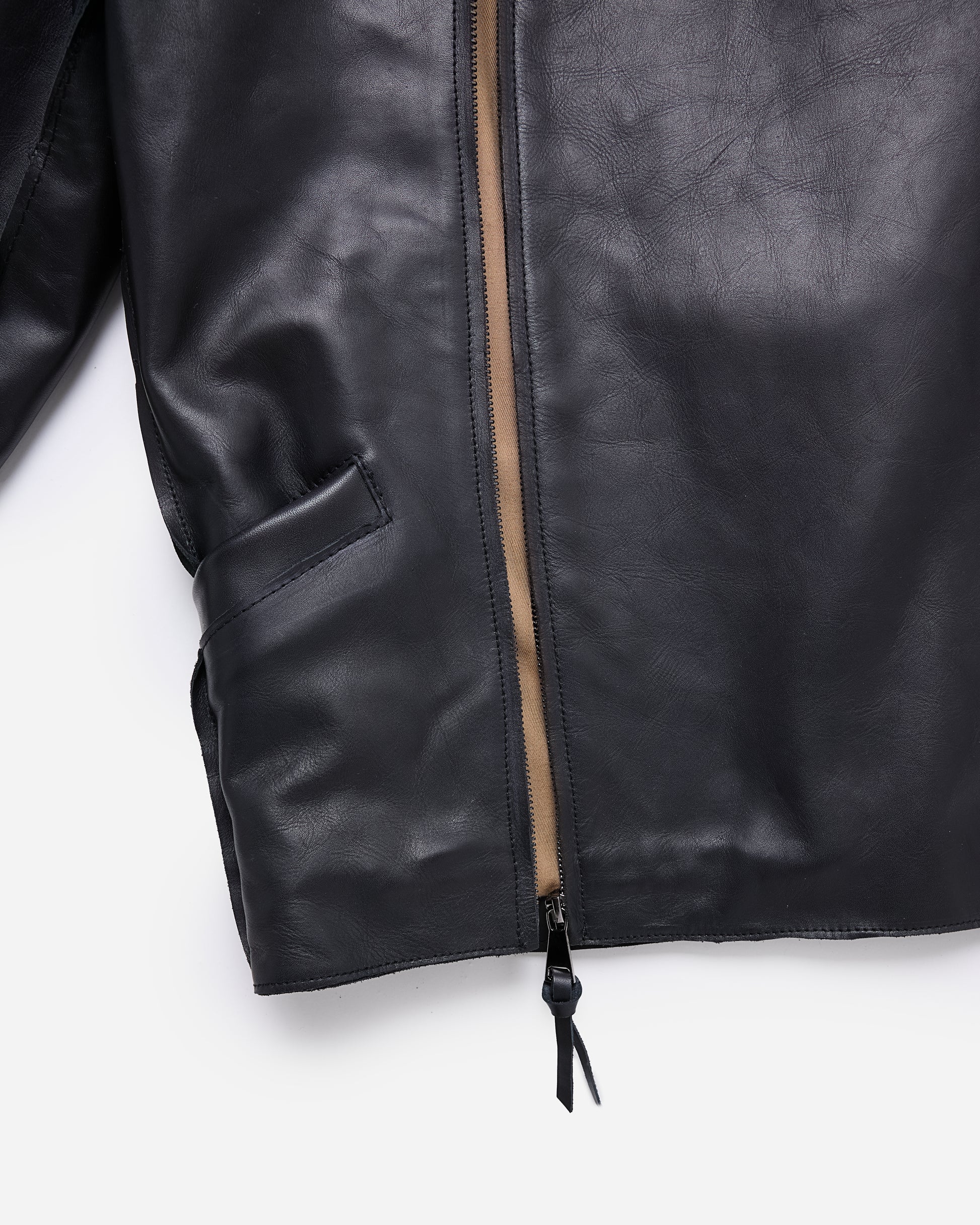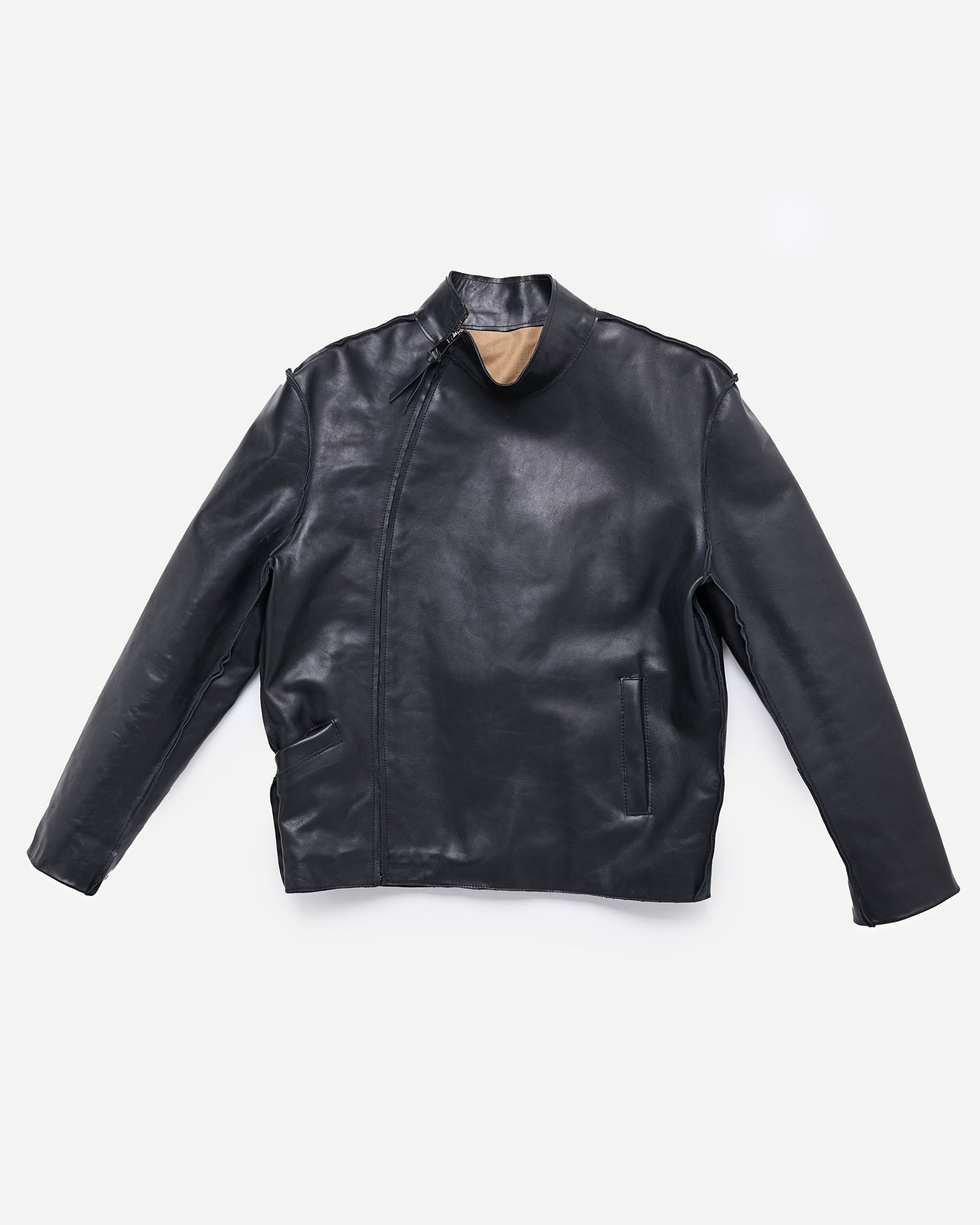 Asymmetric Heavy Biker Jacket – Black – Cowhide Leather – Stand Collar – Asymmetric Zip Closure – Angled Welt Pockets – Zipped Sleeve Ends – Raw-Edge Seams – Fully Lined with Custom Printed Artwork – 100% Leather – Made in Egypt