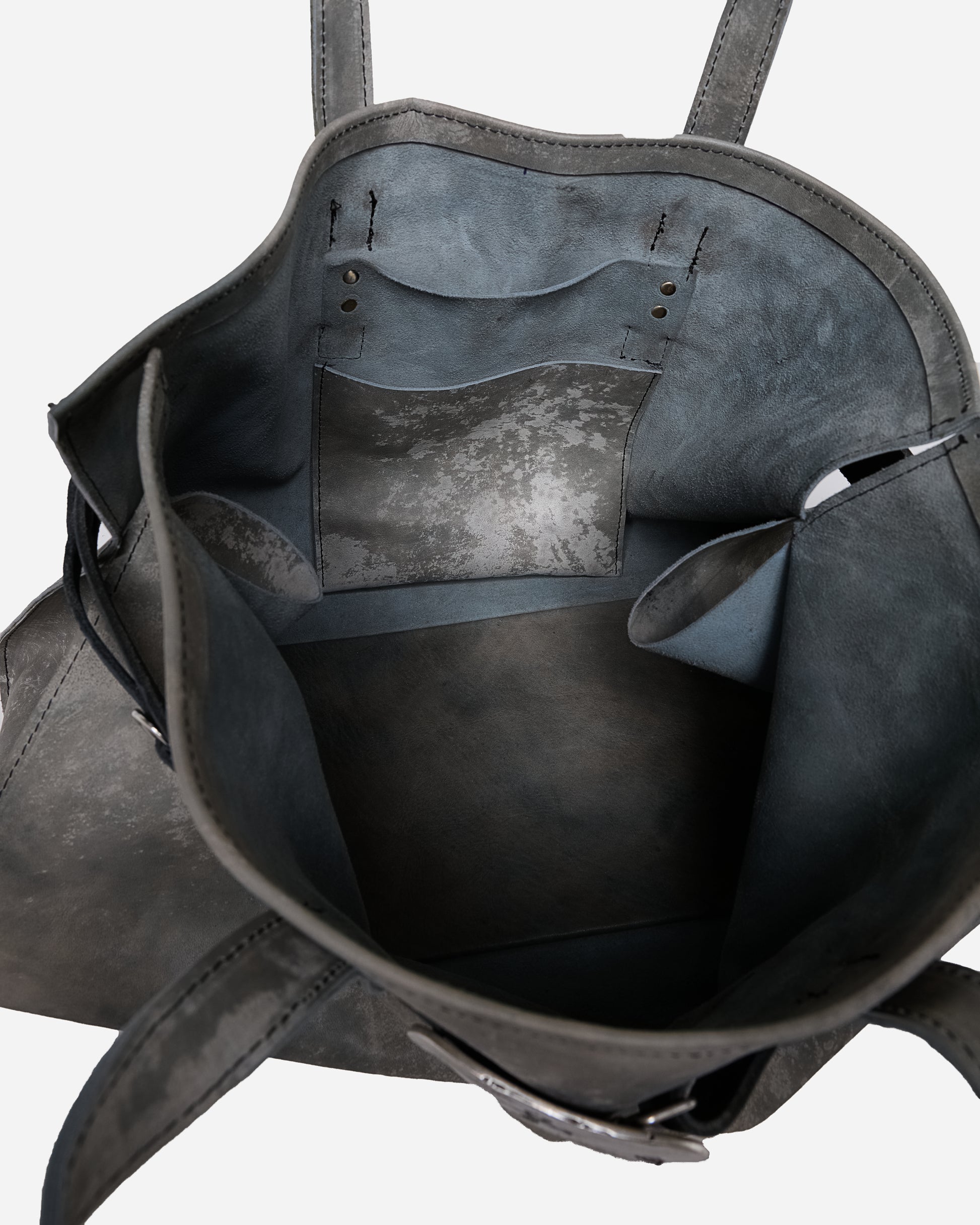 Distressed Grey - Cowhide Leather – Structured Handles – Engraved Plate Buckle Belt Closure – Open Top – Interior Slip Pocket – Raw Edges – Hand Vintaged - Unlined – 100% Leather – Size 56 × 34 × 20 cm – Made in Egypt