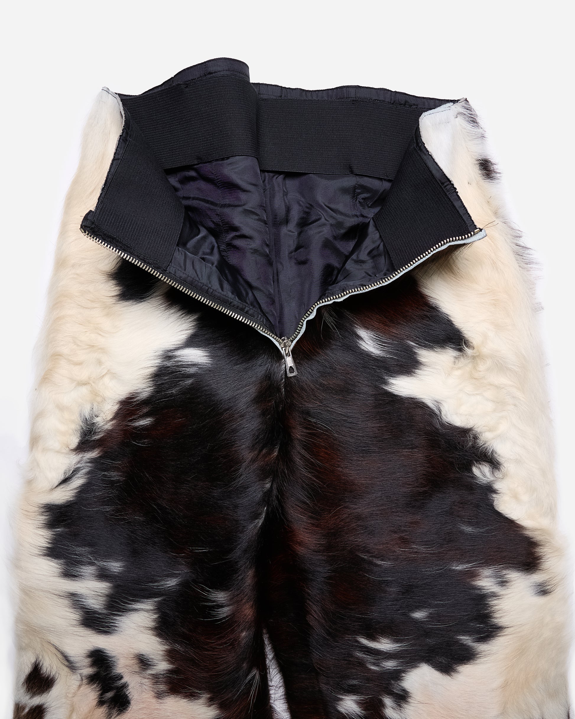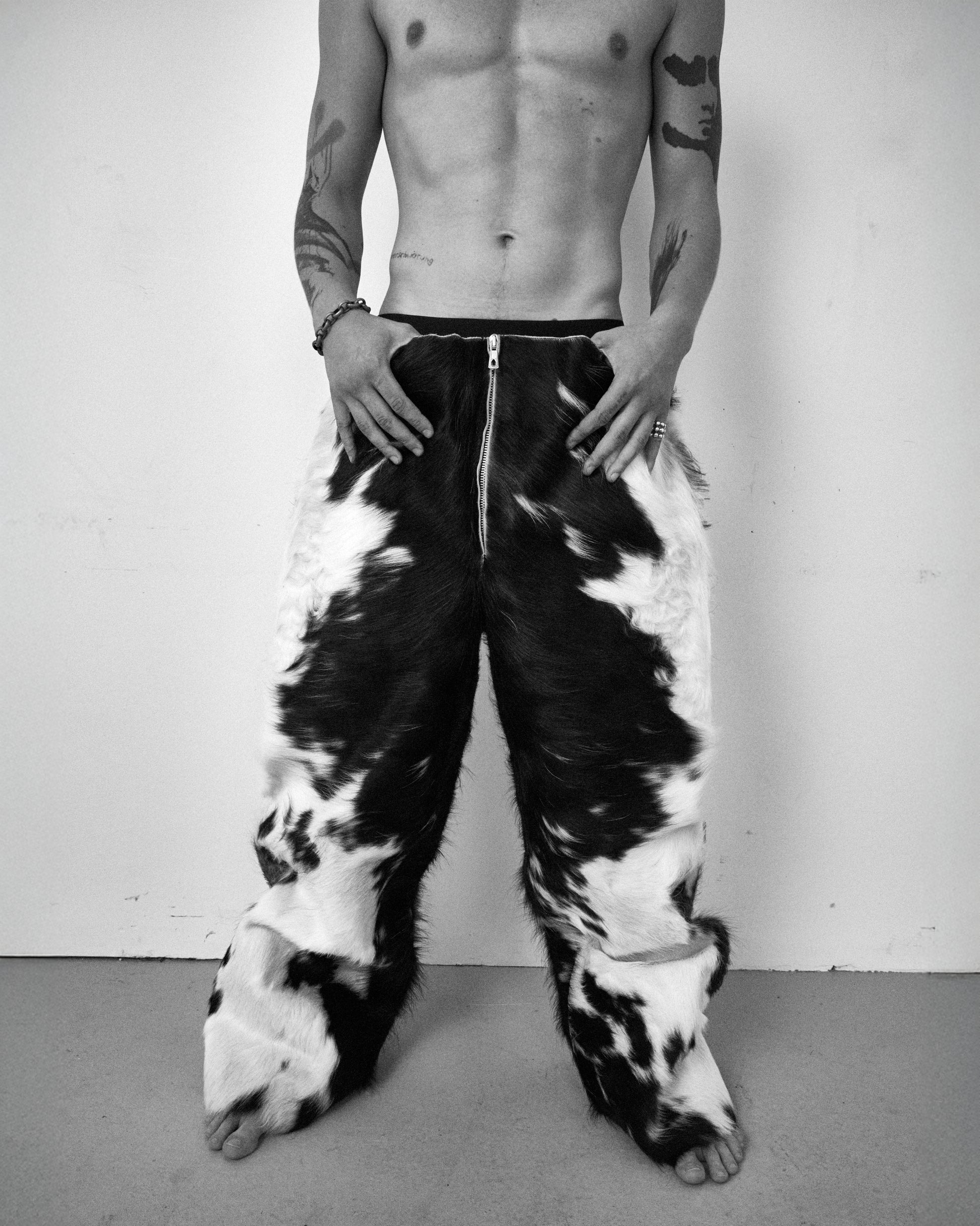 Cowhide Pants – Natural Black/White Pattern – Straight Wide Fit – Full-Length – Front Zip Closure – Engraved Key Logo on Back – Raw Edges – Lined – 100% Cowhide Leather – Made in Germany