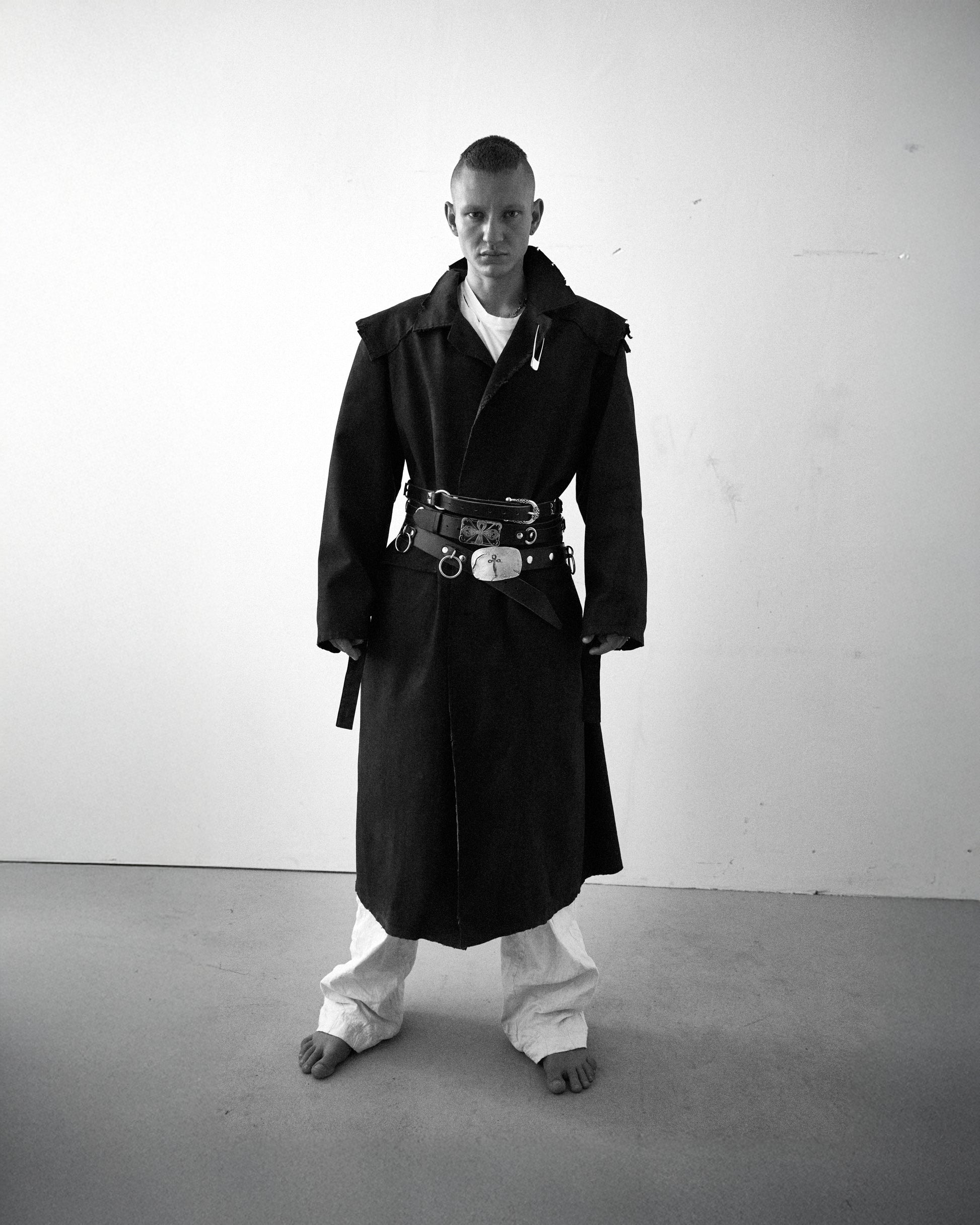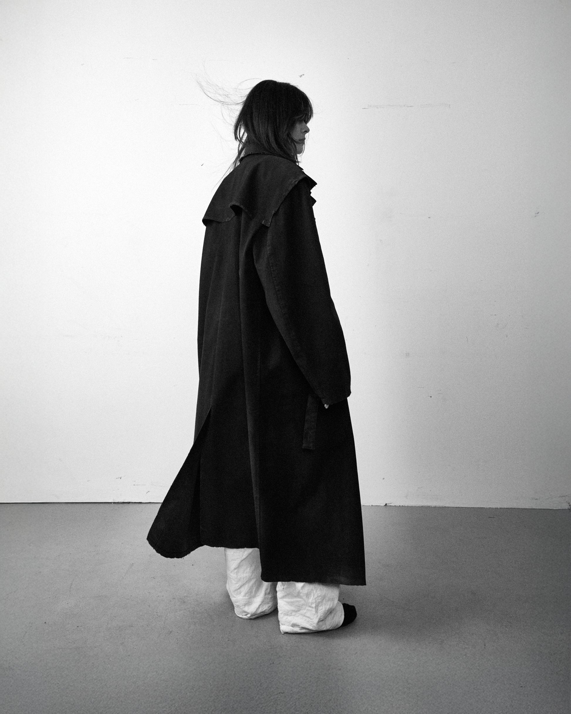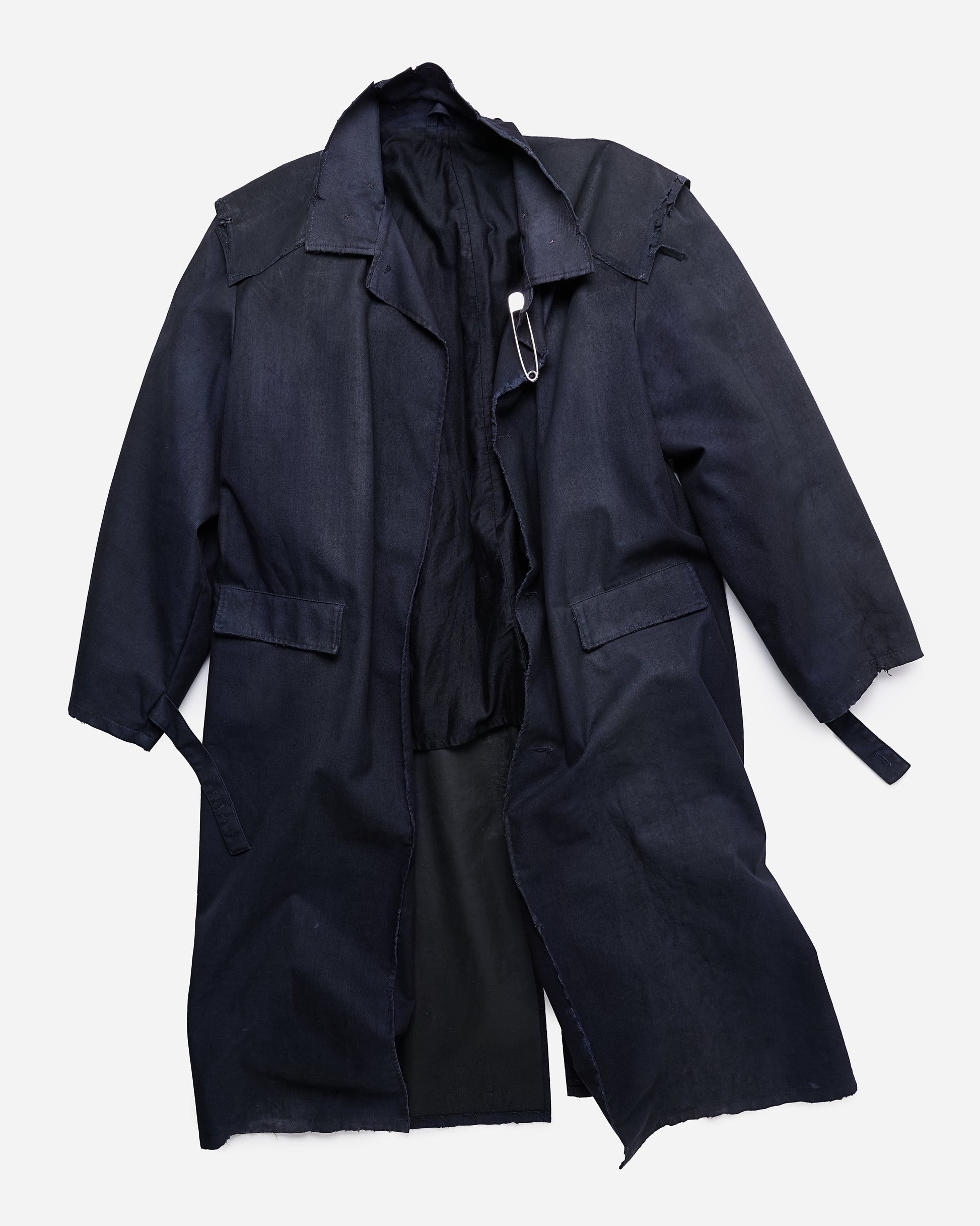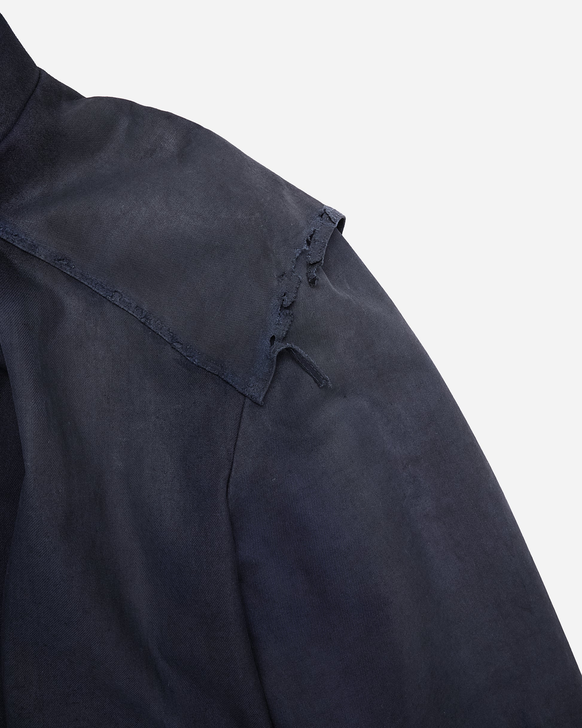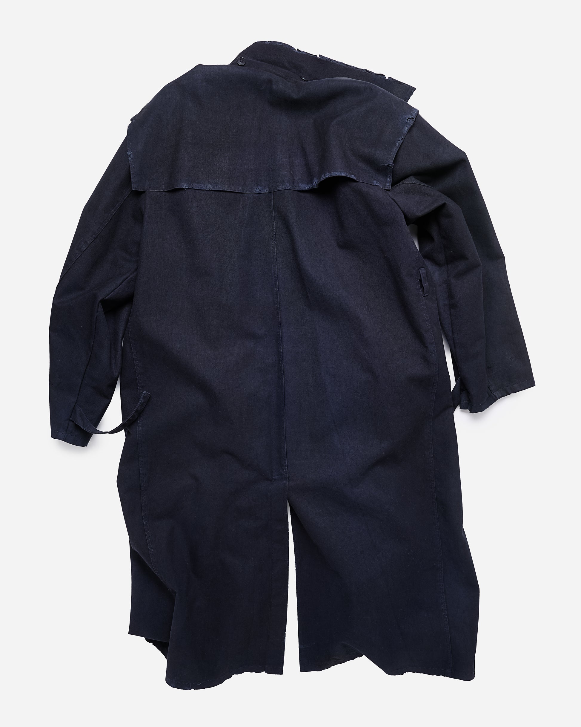 Long Cut – Raw Edge Finishing – Waxed – Wide Lapel Collar with Pin Detail – Deep Front Flap Pockets – Non-Adjustable Straps at Sleeves – Back Vent for Movement – Recycled Deadstock Military Fabric