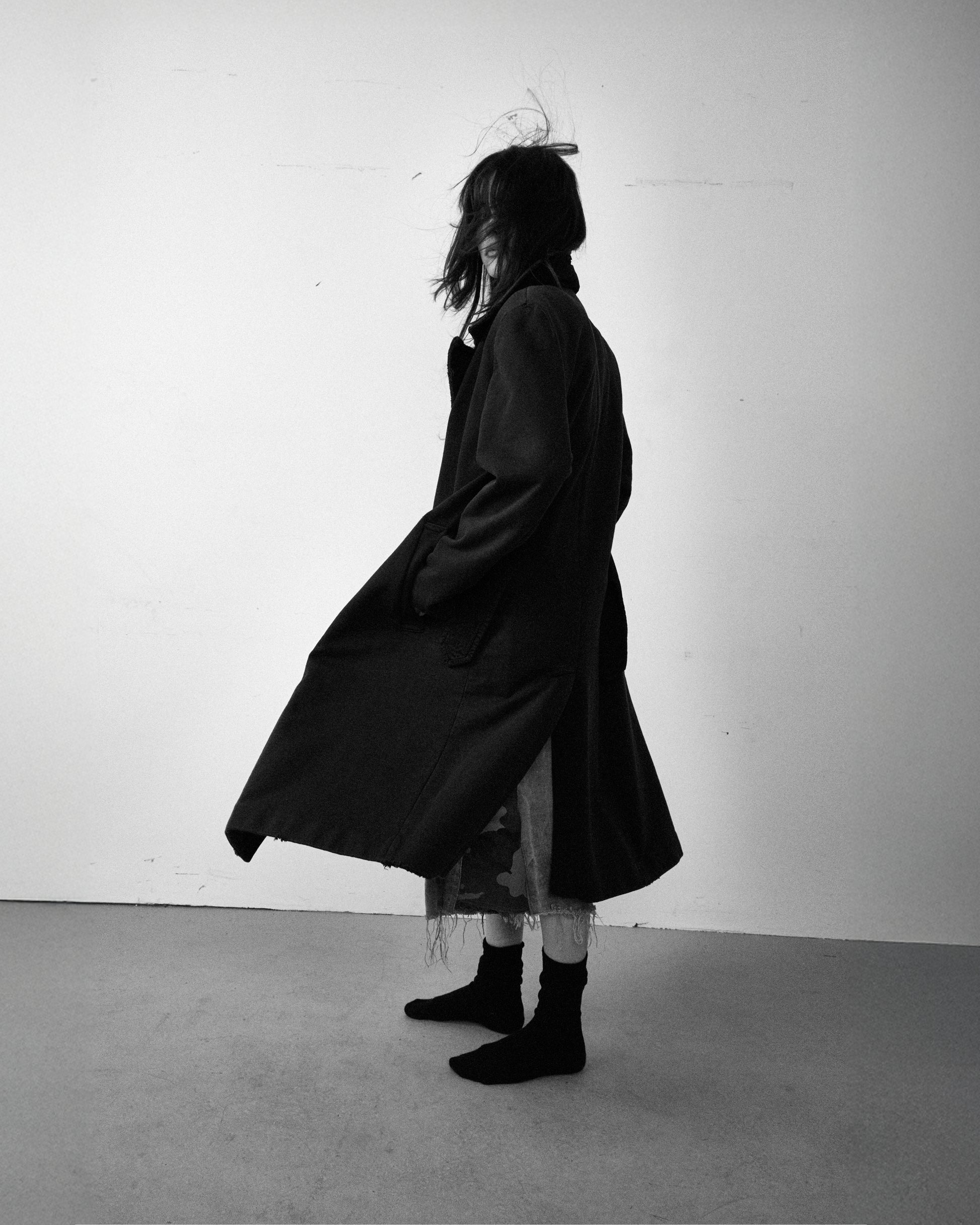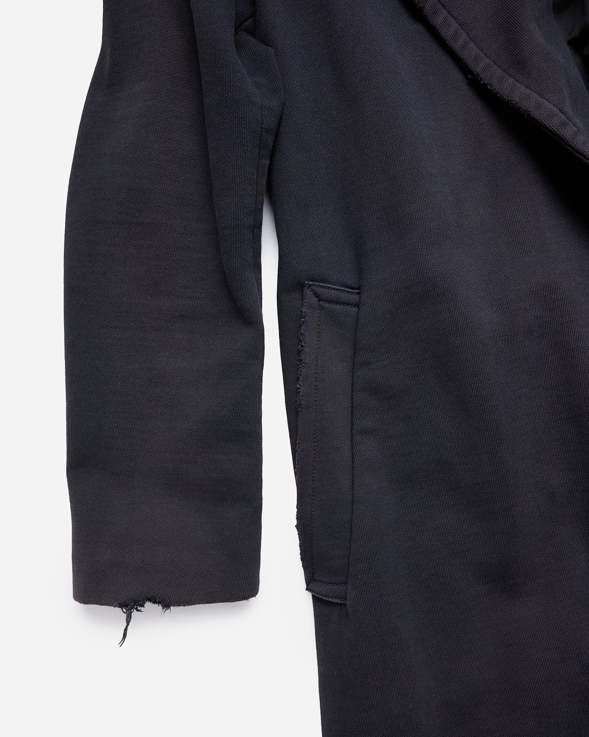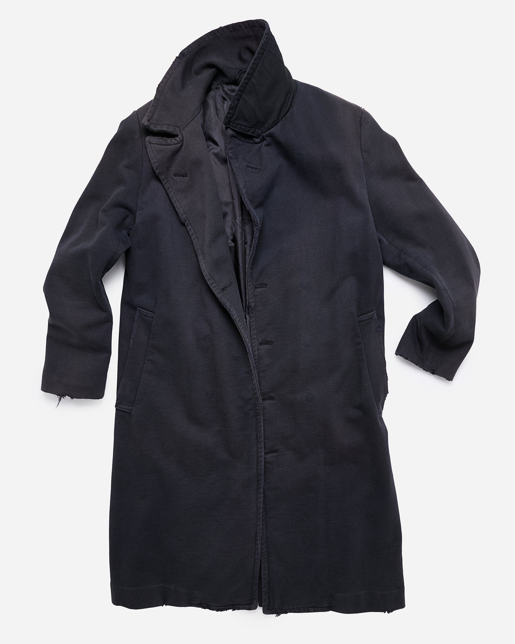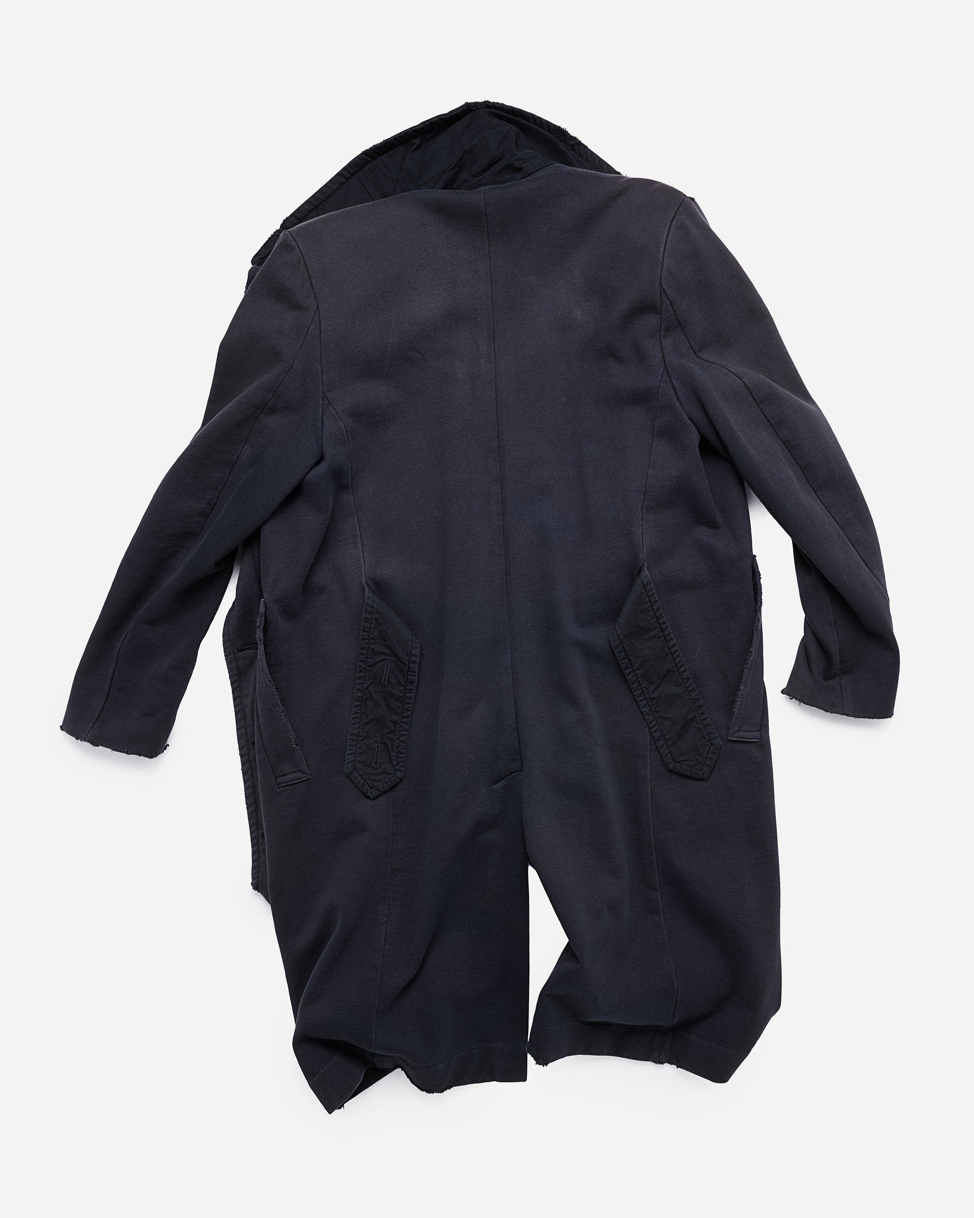 Deadstock Cotton – Raw Edge Finishes at Sleeves and Hem – Extended Collar with Fold Detail – Front Welt Pockets – Back Panel Inserts with Reinforced Stitching – Relaxed Fit – Mid-Length – Fully Lined