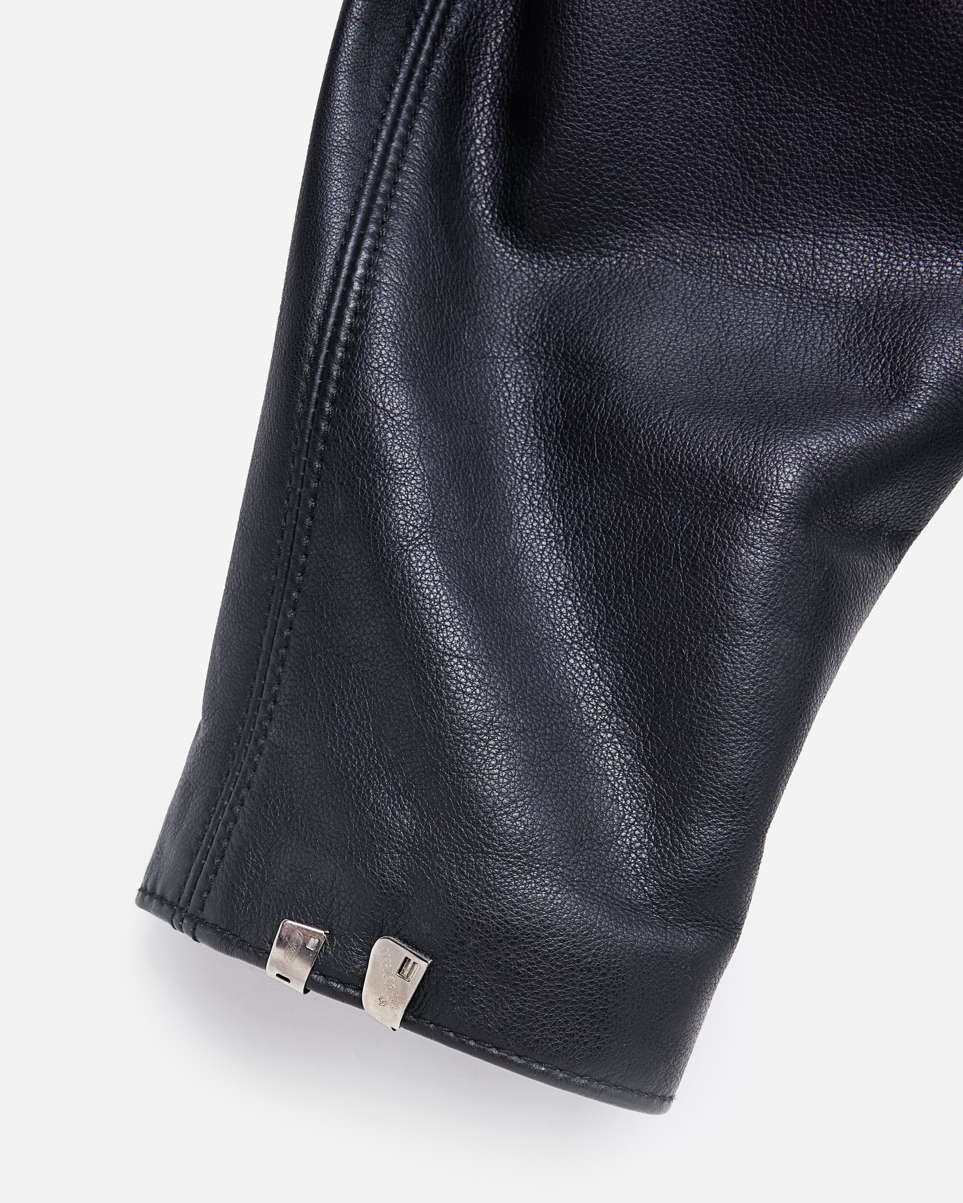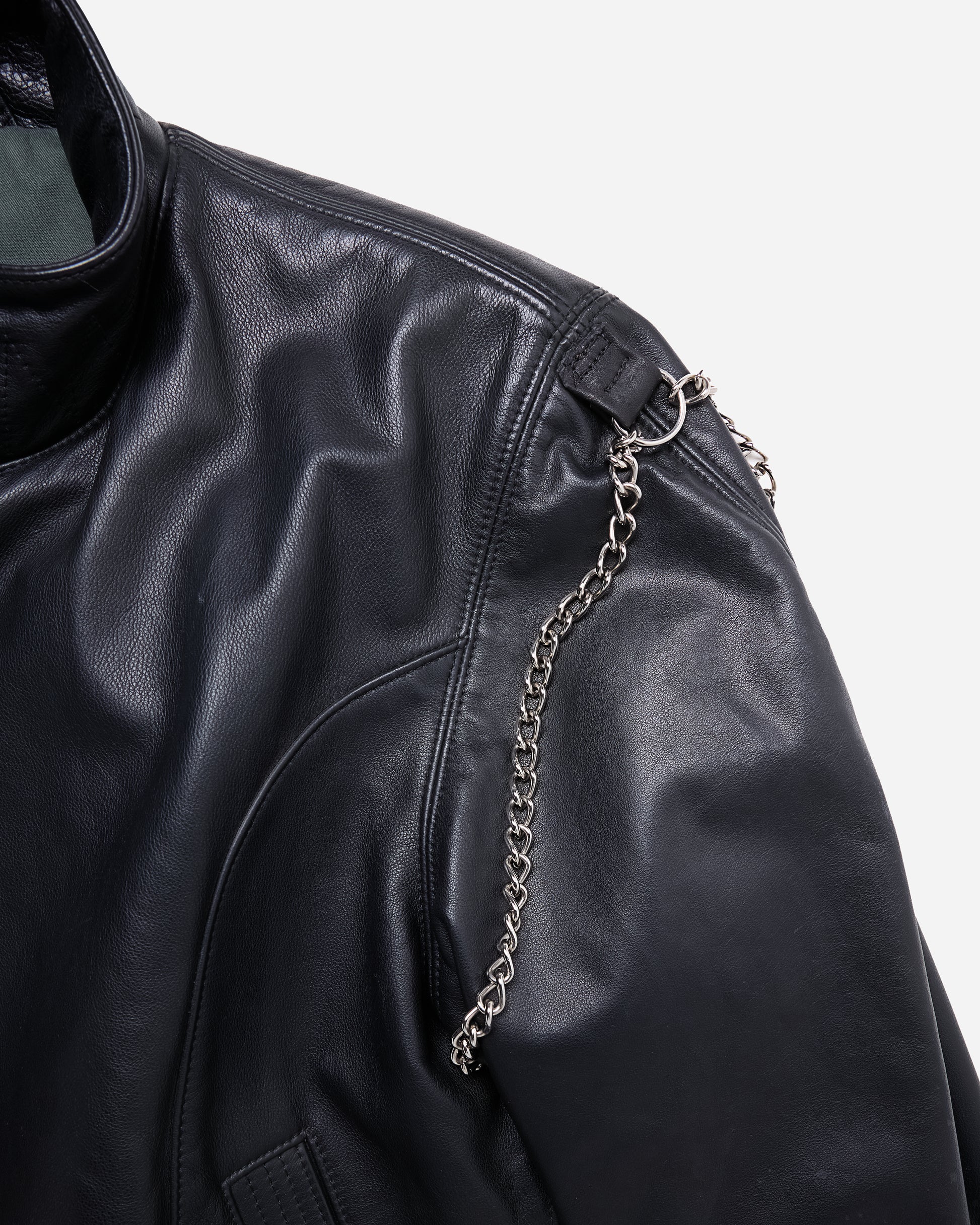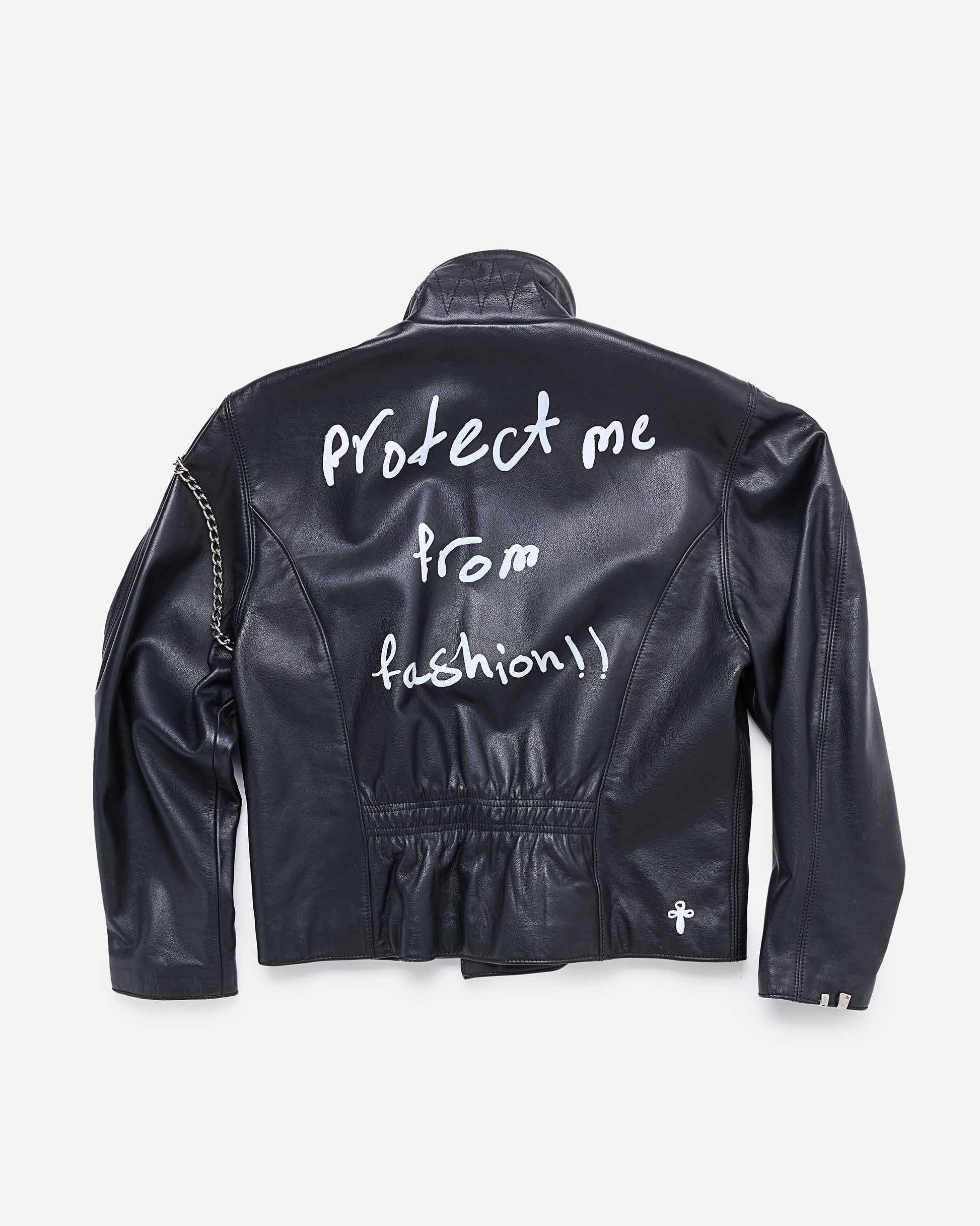 Black - Cowhide Leather – High Stand Collar – Off-Center Front Closure with Metal Fastenings – Quilted Side Panels – Welt Pockets – Chain Detail on Shoulder – Back Hand-Painted Graphic “Protect Me From Fashion” – Hand Vintaged - Fully Lined – 100% Leather, Metal Hardware – Made in Germany