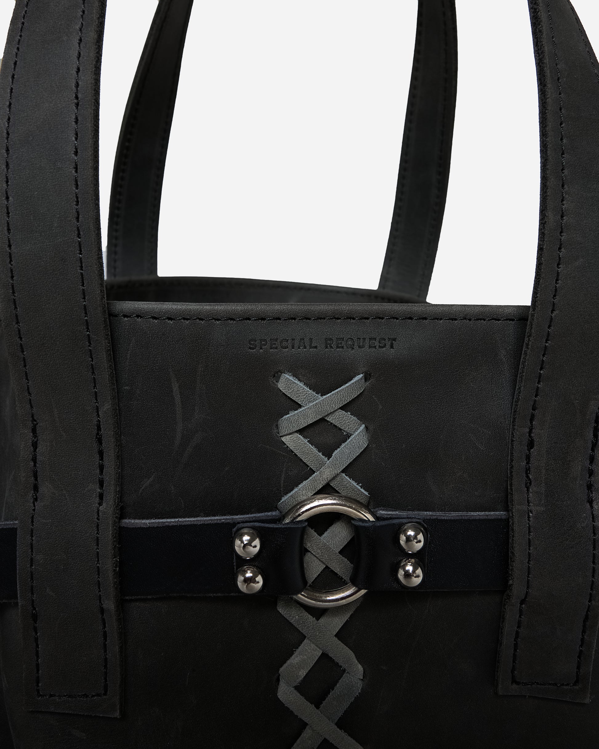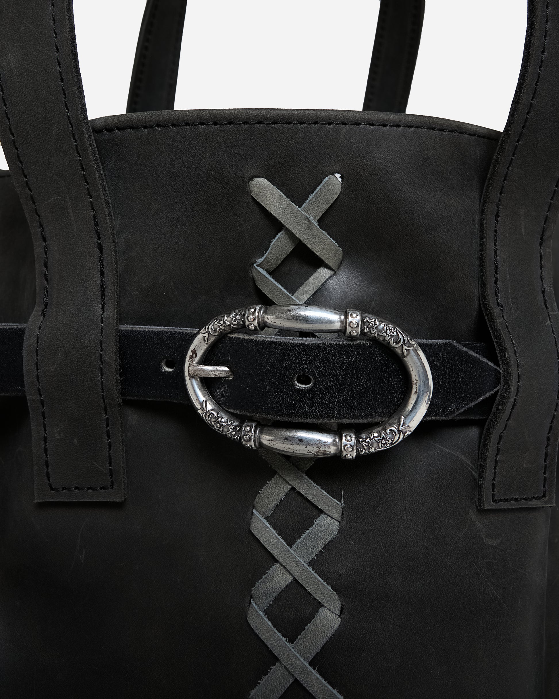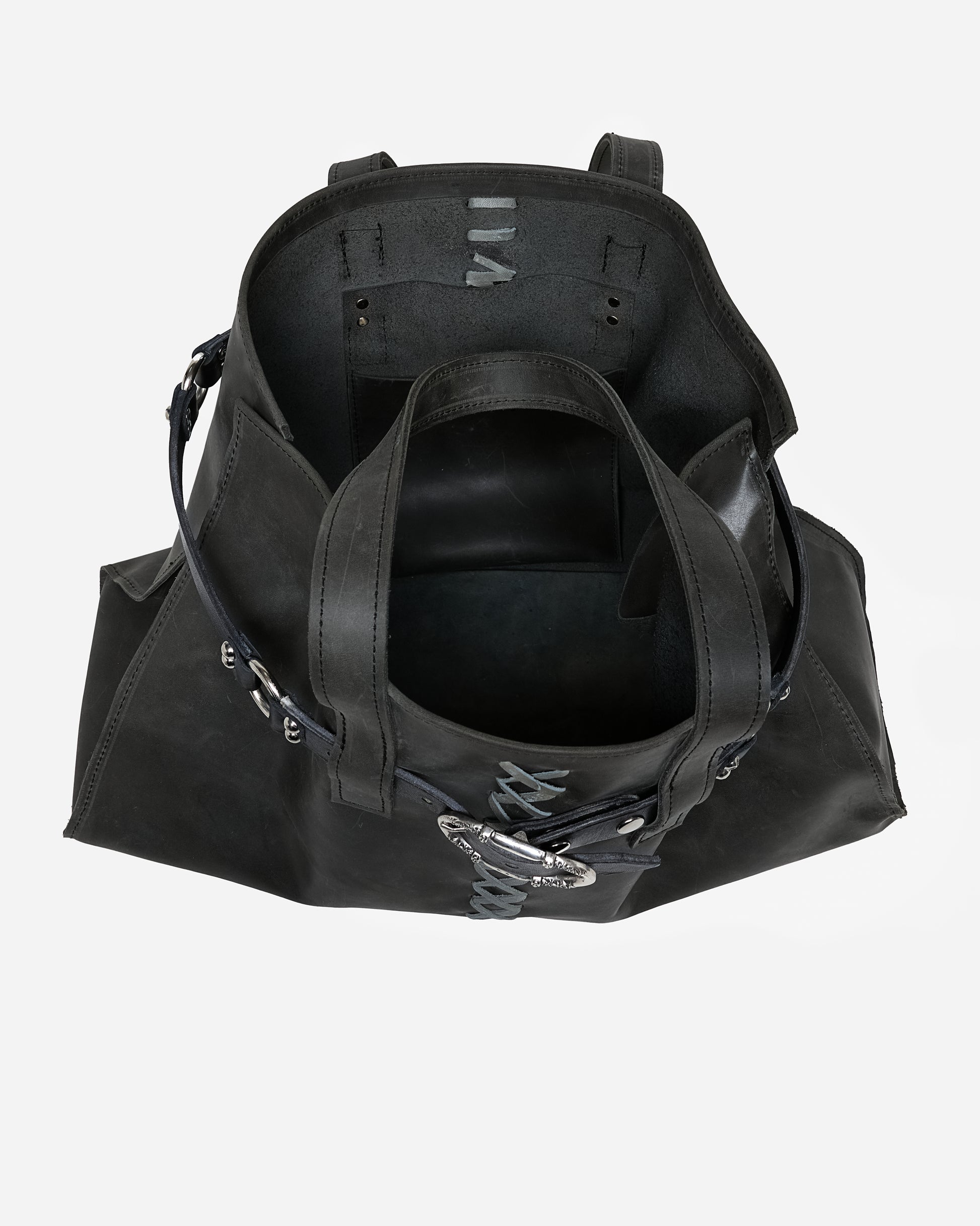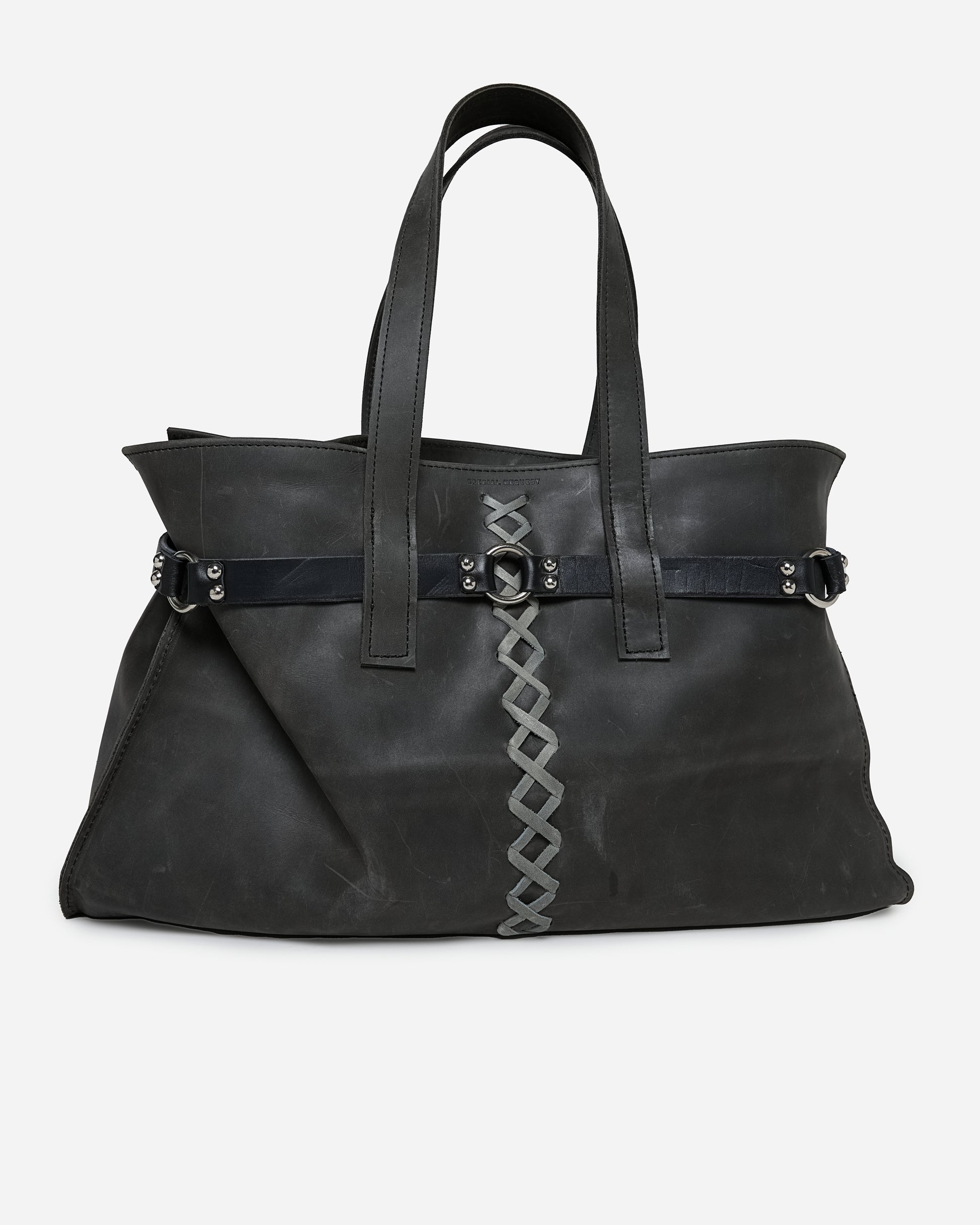 Dark Grey - Cowhide Leather – Structured Handles – Adjustable Belt Closure – Front to Back Cross-Lacing – Open Top – Interior Slip Pocket – Raw Edges – Unlined – 100% Leather – Size 56 × 34 × 20 cm – Made in Egypt